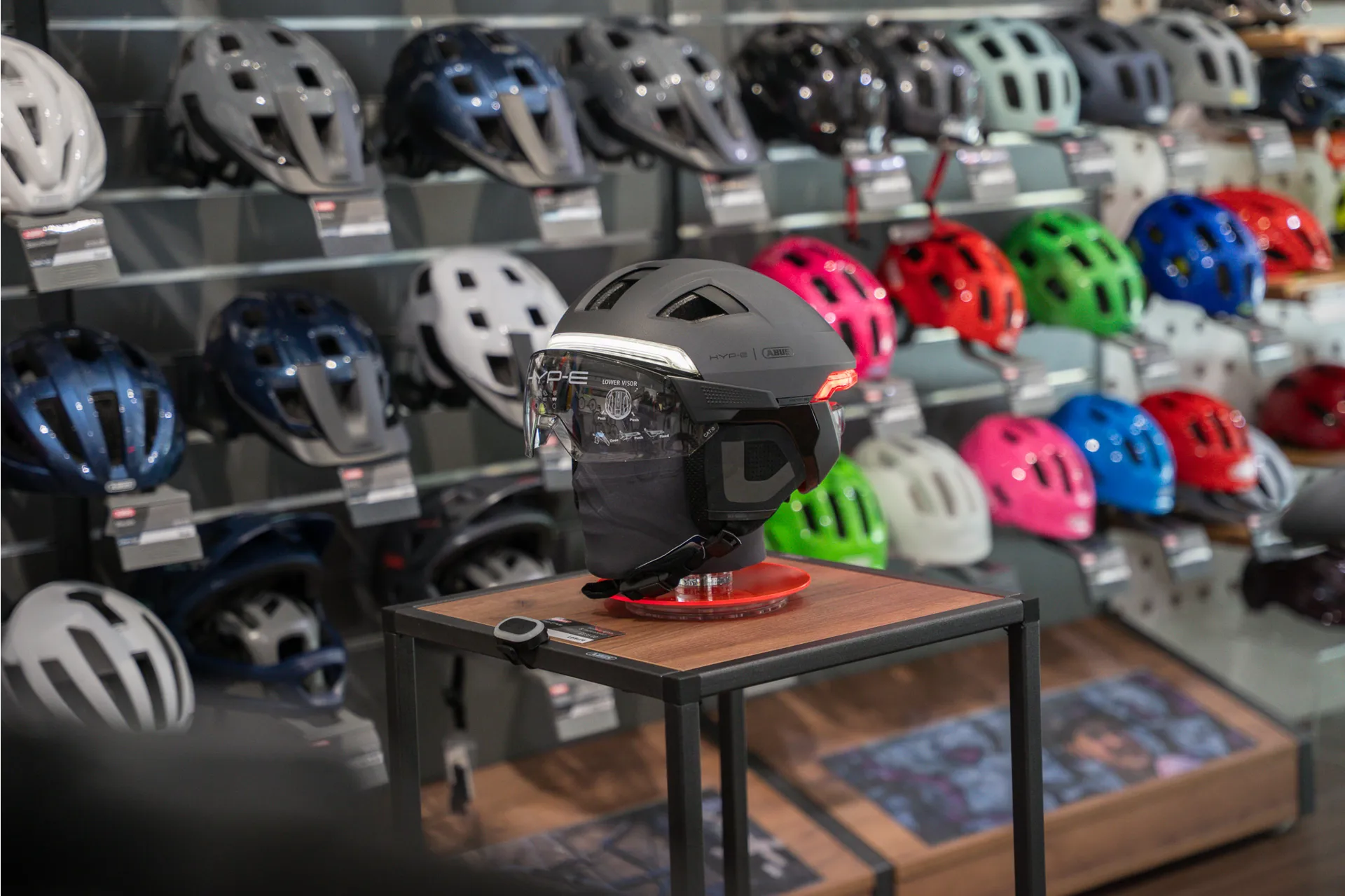 A characteristic lighting concept consisting of rear, front and indicator lights, inspired by the automotive industry, ensures all-round visibility and emphasises the presence of cyclists on busy roads or in poor visibility conditions. The front and rear lights are seamlessly integrated into the multi-shell design of the HYP-E and underline its premium look and feel. A remote control for the handlebars allows you to activate the indicator light, control it intuitively and signal a change of direction clearly and in good time.